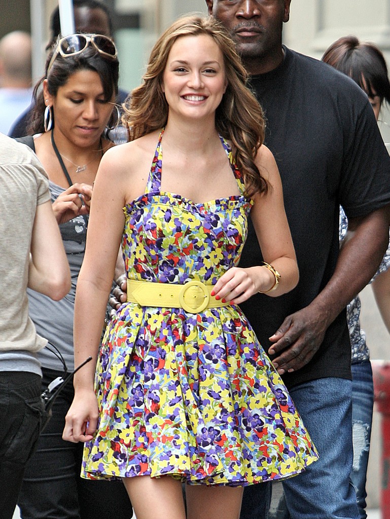 | Leighton Meester in an Alice & Olivia floral dress with ruffles across the neckline. |